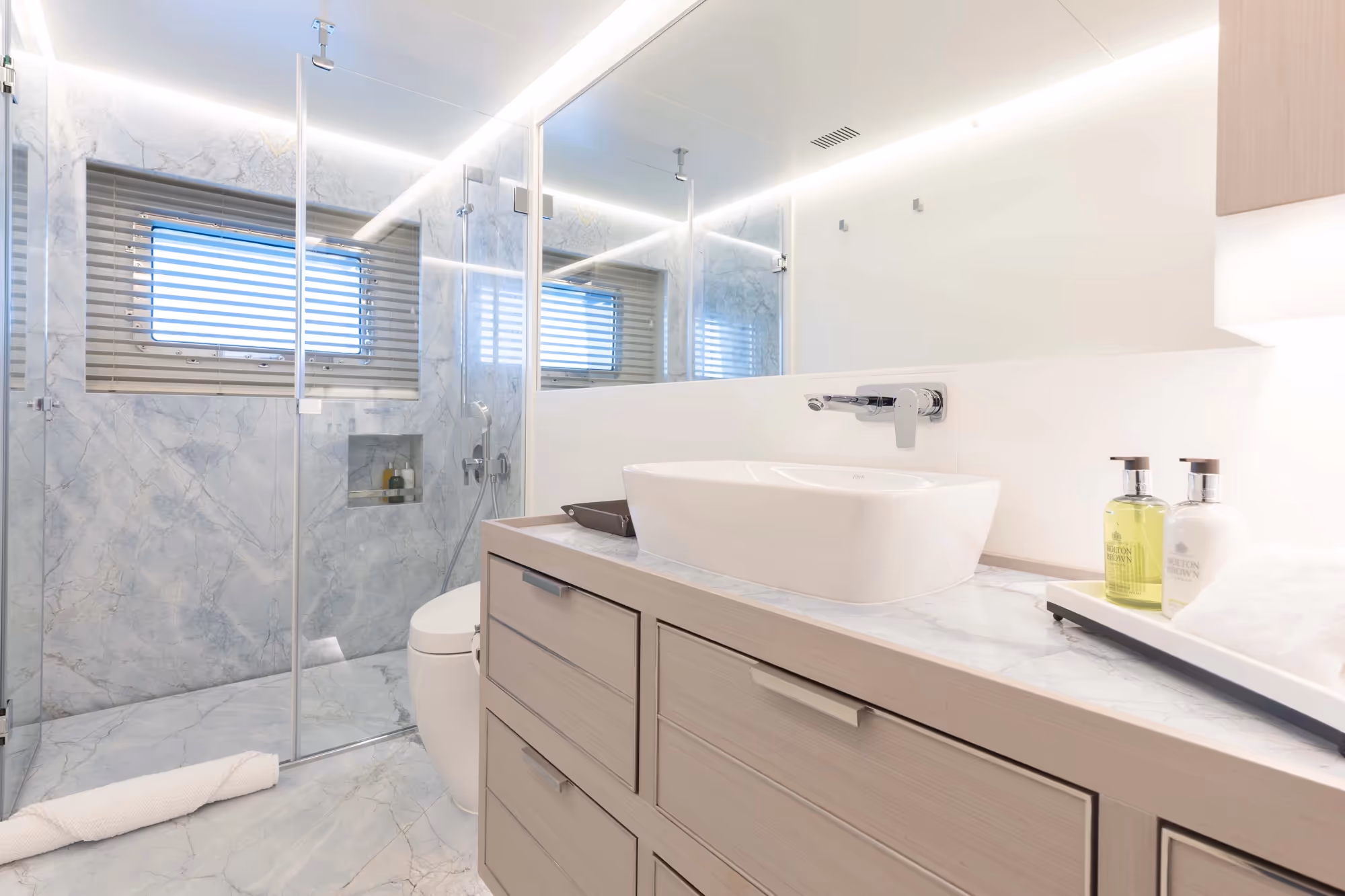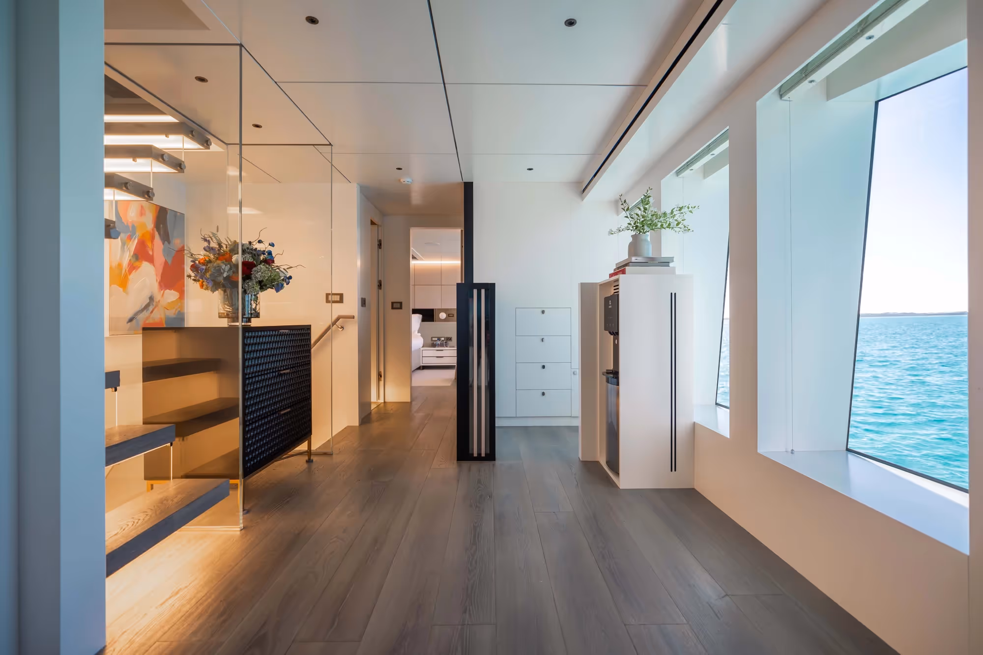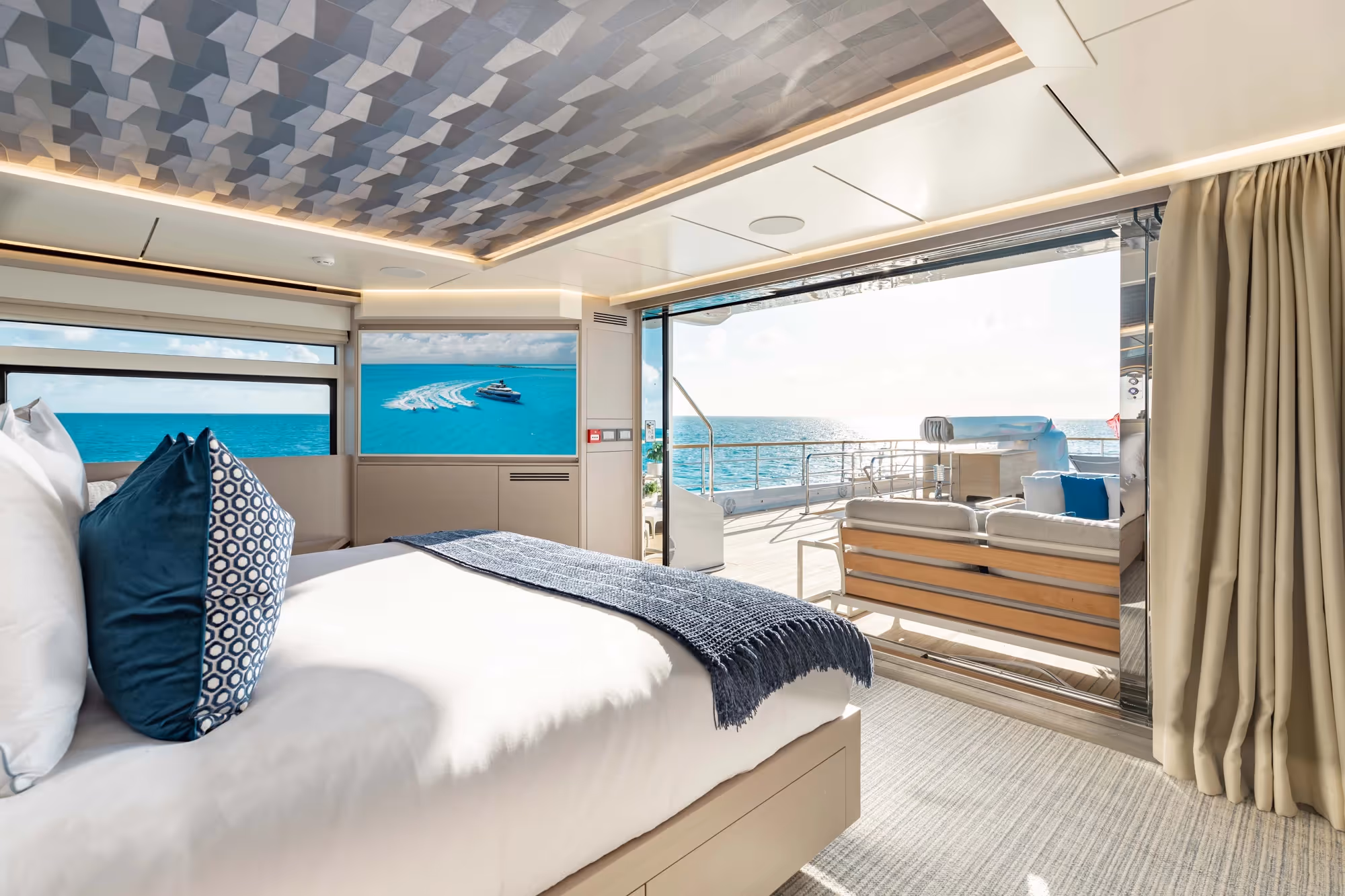 AMORE sleeps up to 12 guests in 6 luxurious staterooms, including 4 doubles, 1 twin, and 1 single. Key highlights include a master suite on the main deck and a bonus master suite on the bridge deck, both featuring ensuite facilities.