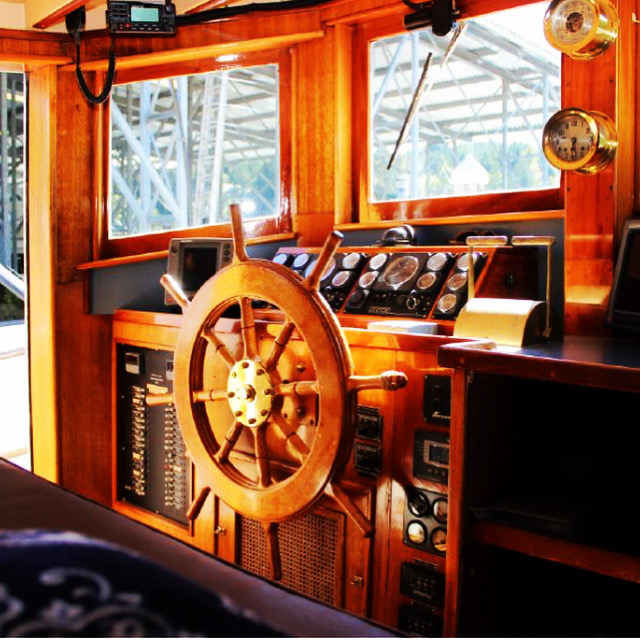 New fir decks installed during 2002 refit. Aluminium bulwarks capped with Angelique hardwood. Bronze railings, custom masts, and cargo booms with winches.