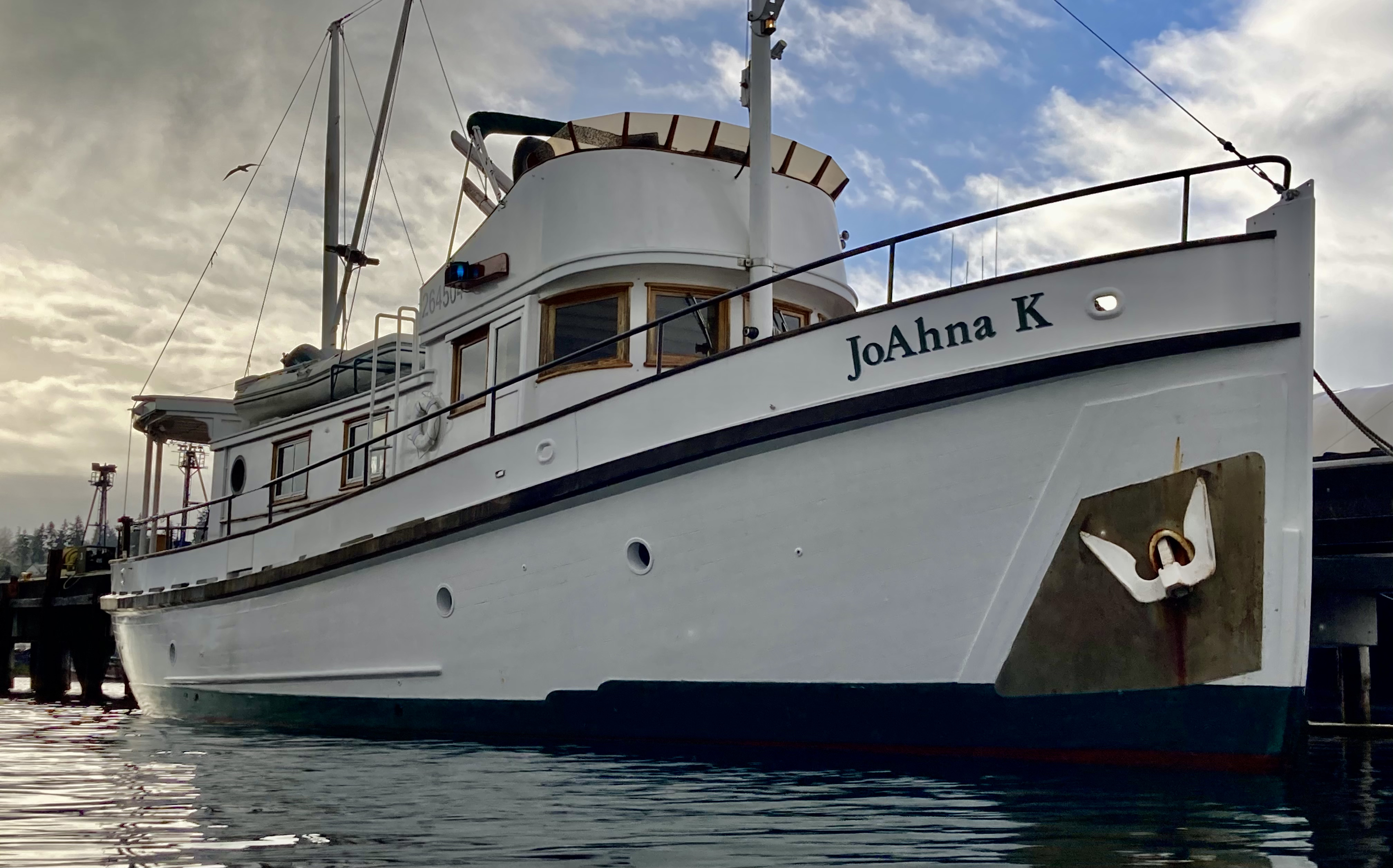 Built in 1952 by Fellows & Stewart in San Pedro, JoAhna K is a 58-foot heavy timber motor yacht designed by William Garden. Originally commissioned for long-range exploration, she carries 3,200 gallons of fuel and 800 gallons of water, offering a true passagemaking range of over 4,000 nautical miles. Her story includes Hollywood origins, two decades of Alaskan charter service, and extensive professional restoration. A major refit in 2002 (costing over $750,000) included twin John Deere Lugger diesels, a Northern Lights generator, Hurricane hydronic heat, updated electrical systems, modern electronics, new shafts, props, plumbing, and three VacuFlush heads. A later fire was contained, and the yacht underwent another 1.5-year professional rebuild that restored her.