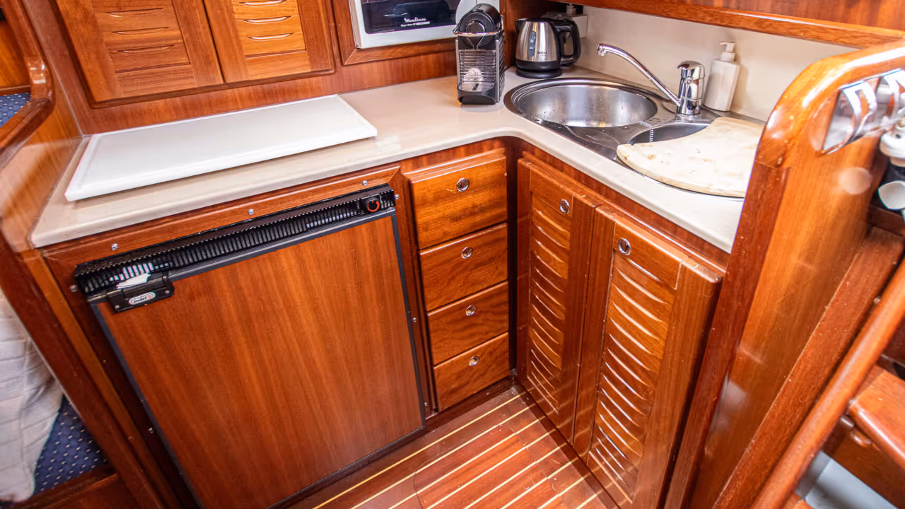 Two cabin layout with forward owners cabin featuring a French berth, hanging lockers and storage. Guest cabin with twin berths. Shared bathroom with electric toilet, basin and shower. Convertible dinette in saloon. Galley with corian worktop, double stainless sink, electric two zone cooker, combi microwave and twin Indel B fridges. Teak interior with ample seating and wheelhouse visibility.