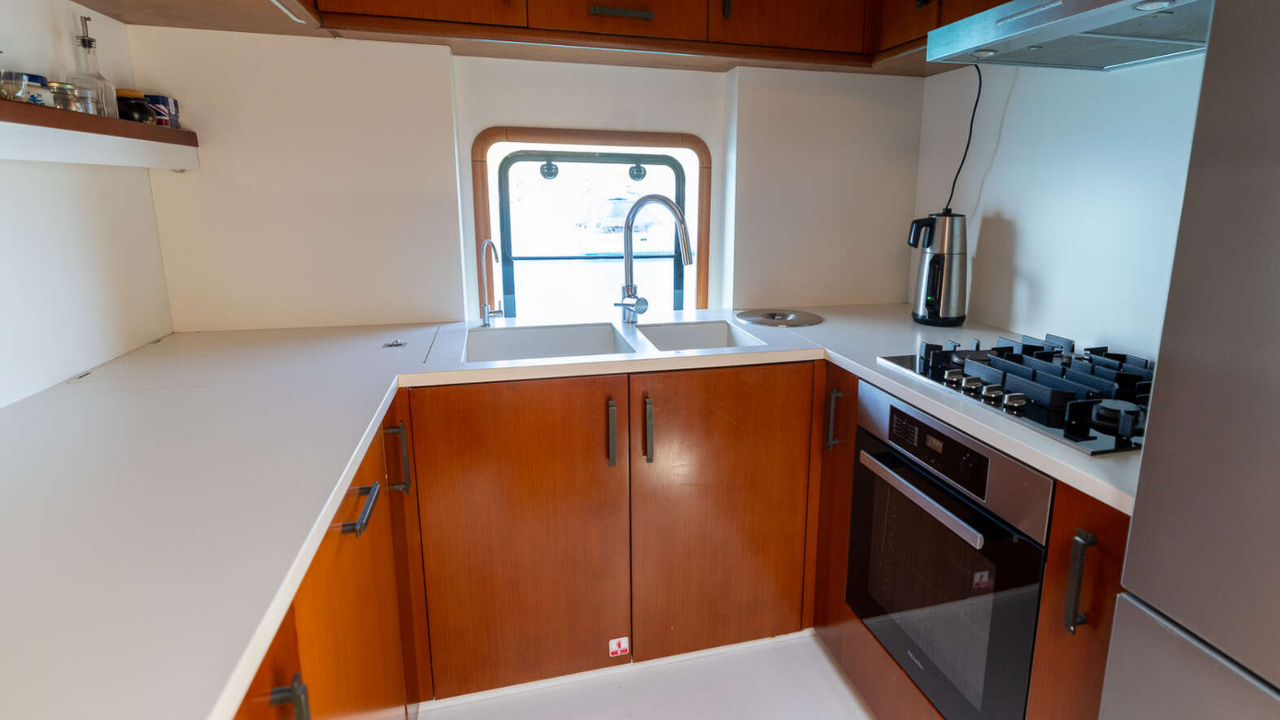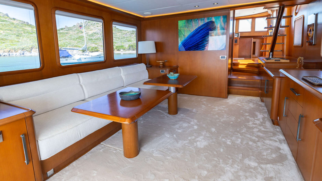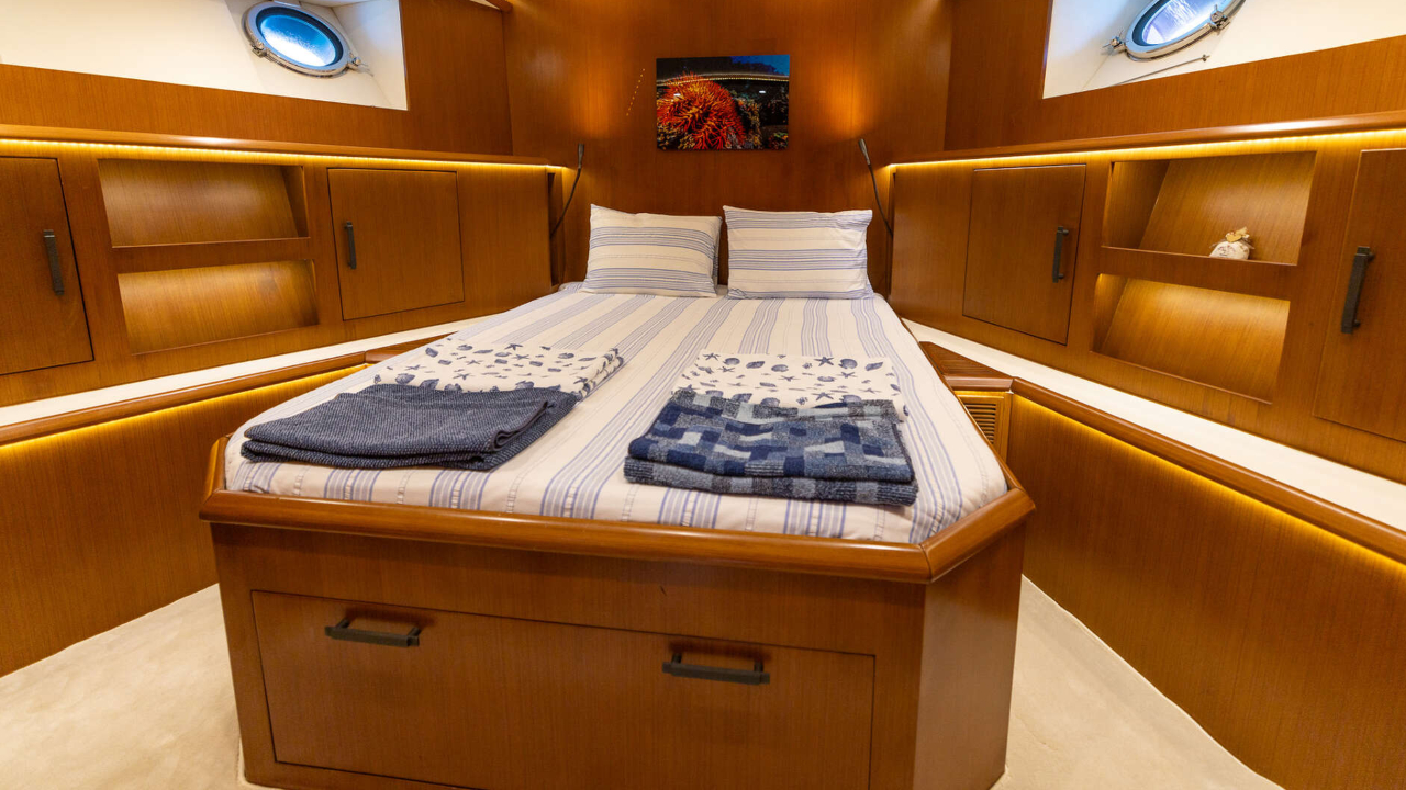 Three guest cabins, all en suite, plus a separate crew cabin for two. The owner cabin has a French bed with its own shower and heads. Two guest cabins each have twin single berths and en suite facilities with Tecma electric toilets. Interior ceilings were renewed in 2020 and the full carpet set was replaced in 2025. Cruisair air conditioning is fitted throughout at a rated 96,000 BTU with Somfy remote controlled blinds. Laundry is by a Bosch washer dryer.