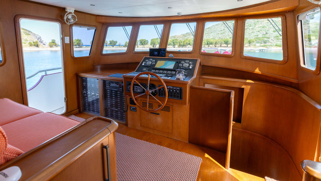 Ezberci 3000 retractable telescopic gangway, Lofrans Titan B 2300 windlass, 4 metre Brig RIB with Yamaha 50 hp outboard, and an Ezberci flybridge deck crane rated at 500 kg installed in 2022. Speich wipers are fitted. Teak surfaces were refurbished or renewed in 2020. Underwater lights were renewed in 2025. Hydraulic steering is fitted at the lower helm and flybridge.