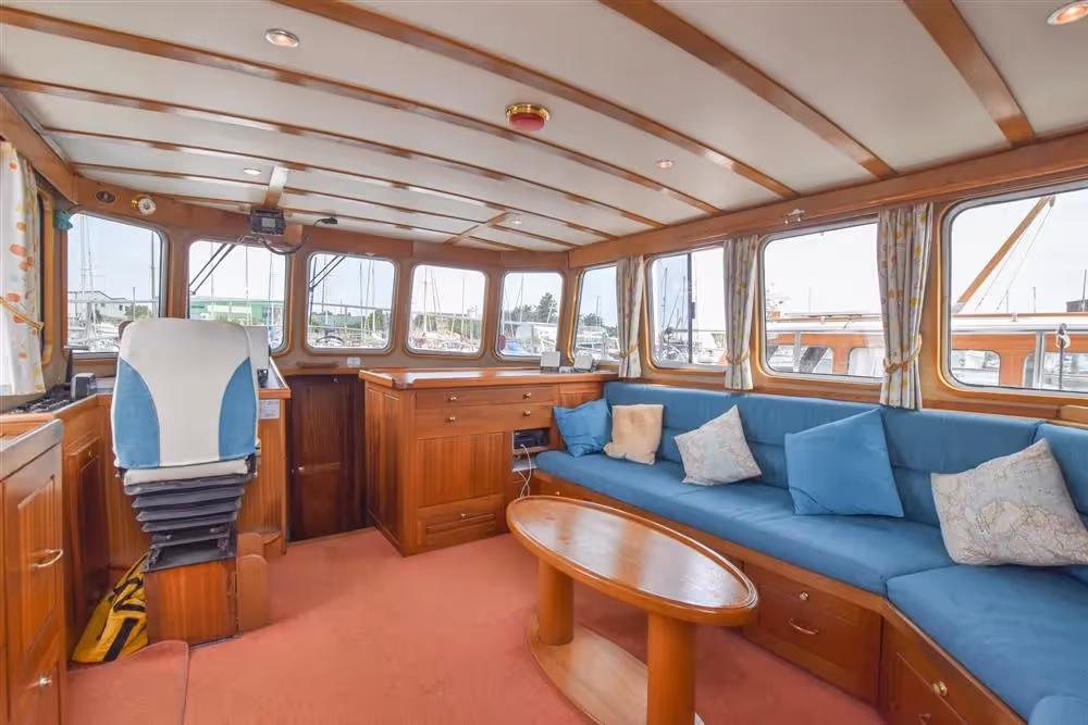 The 1999 Vripack Stentor 1300 is a steel explorer yacht built for inland, coastal and offshore cruising. She carries 4,250 L (≈ 1,122 US gal) of fuel, a 250 L (66 gal) blackwater tank and 120 L (32 gal) greywater tank. Powered by a Perkins Sabre M130C diesel, she cruises at ~6 knots using 8 L/h and reaches ~9 knots maximum. The layout includes two cabins, two heads (freshwater flush), a raised saloon with internal helm, electric galley via inverter, heating and full generator backup. She features a 13.31 m length, 4.40 m beam and a steel hull with strong structural framing. Currently listed at £115,000 and ideal for serious liveaboard cruising.